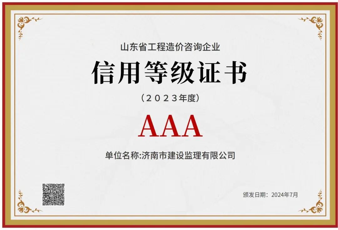喜報!濟(jì)南監(jiān)理獲評2023年度山東省工程造價咨詢企業(yè)信用等級評價AAA等級