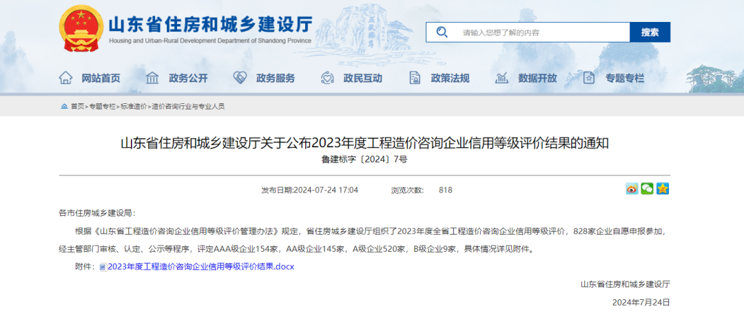 7月24日,山東省住房和城鄉(xiāng)建設(shè)廳公布了“2023年度山東省工程造價咨詢企業(yè)信用等級評價結(jié)果”,全省共有828家企業(yè)參加本次評審,我公司在此次造價咨詢企業(yè)信用等級評價中獲得最高“AAA等級”評價。