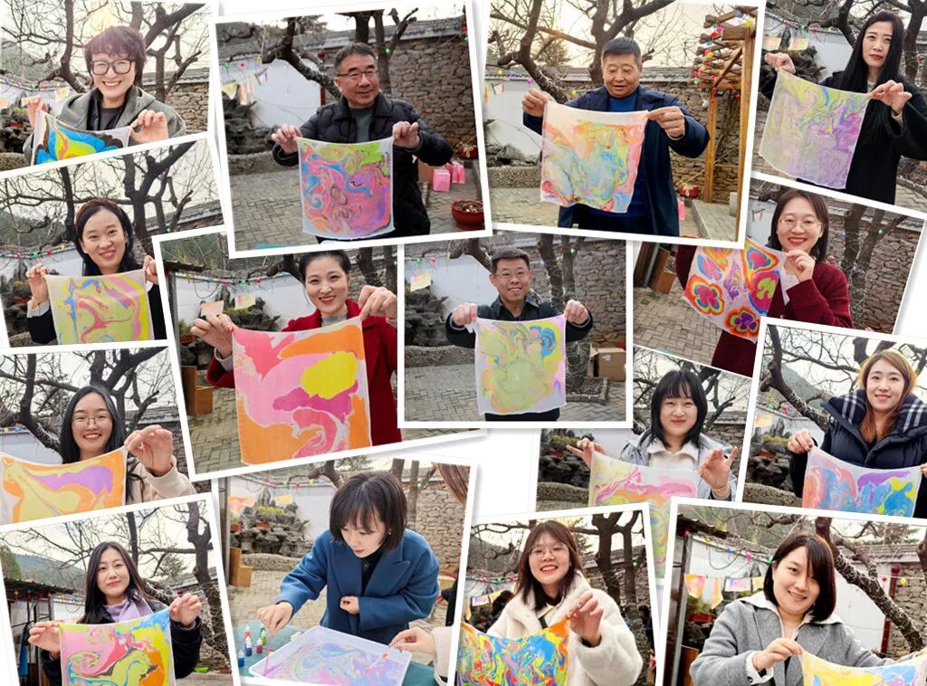 品嘗完甜蜜的糖葫蘆,大家又紛紛投入到水拓畫絲巾活動中。創(chuàng)作、水拓、固色再到晾干,隨著一幅幅色彩斑斕的畫作拓印于絲巾之上,大家由衷地發(fā)出歡呼和贊嘆,欣賞著這份獨一無二的美,感受非物質文化遺產水拓畫的獨特魅力。水拓絲巾的制作不僅考驗著大家的耐心與細心,更是一次對美的追求與探索。